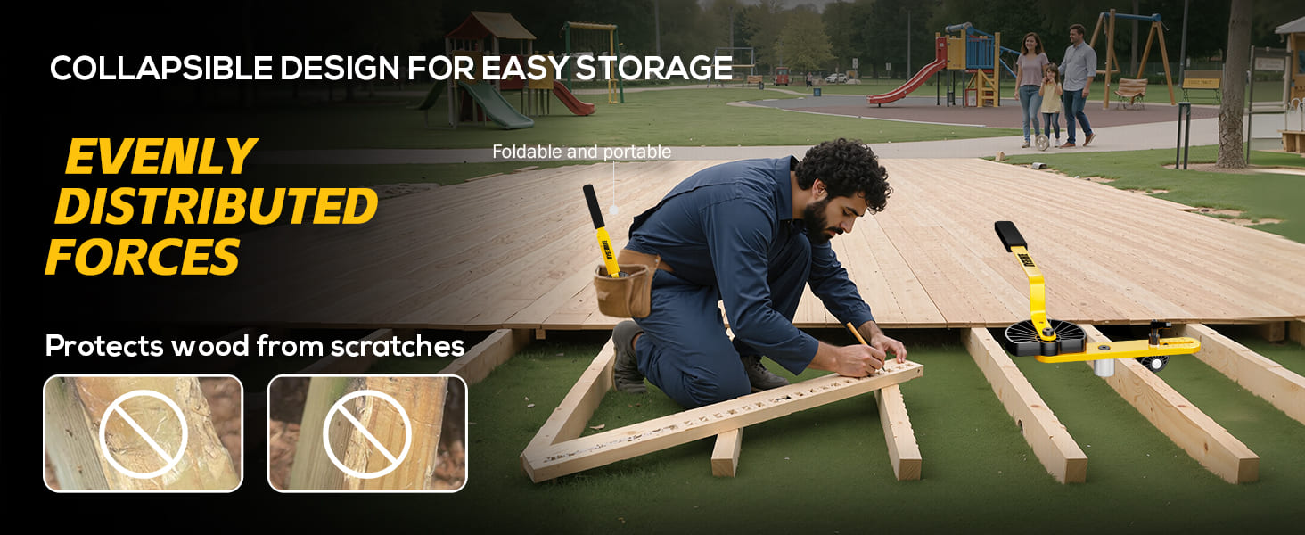 - Optimized for Efficiency: Our deck straightening tools feature adjustable joist spacing (1.36″-2.62″ in locked condition and 1.5″-3″ in released sag condition), compatible with boards 0.51″ and thicker. The adjustable pallet wheels allow multi-angle straightening to meet strict construction site requirements.